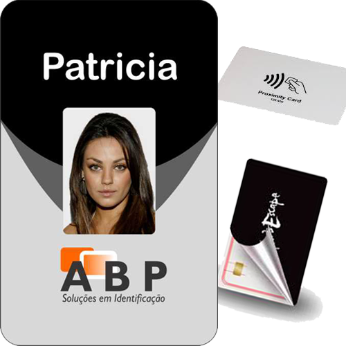 Crachá em PVC com Chip Proximidade tamanho padrão CR80 54X86mm. Crachá frente colorida e verso com dados impresso em 1 cor.