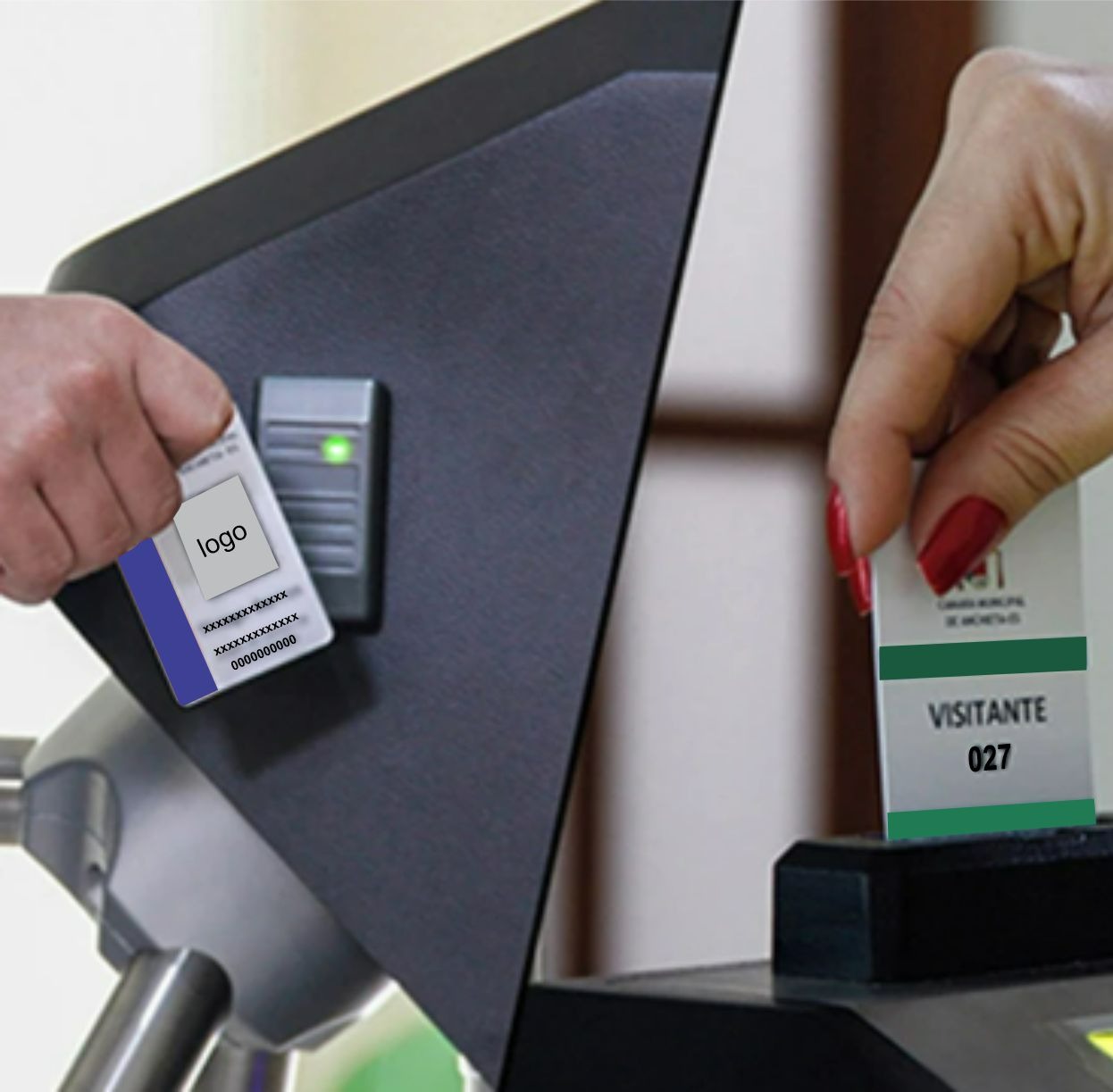 Crachá em PVC com Chip Proximidade tamanho padrão CR80 54X86mm. Crachá frente colorida e verso com dados impresso em 1 cor.