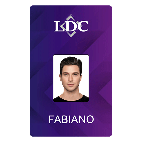 Crachá em PVC Laminado tamanho padrão CR80 54X86mm. Crachá com frente colorido, e verso com uma cor. Fabricamos crachás com código de barras e QRCODE. Opcional furo ovoide.